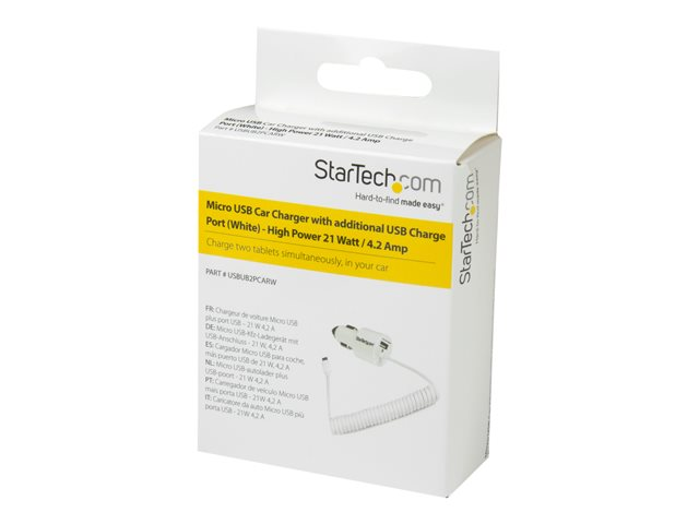 StarTech.com Chargeur voiture double - Adaptateur allume cigare avec câble Micro USB et port USB 2.0 - Haute puissance 21W / 4,2A - Adaptateur d'alimentation pour voiture - 21 Watt - 4.2 A - 2 connecteurs de sortie (USB, Micro-USB de type B) - sur le câble : Micro-USB - blanc - pour P/N: USBLT1MW, USBLT1MWS, USBLT2MBR, USBLT2MW, USBLT30CMW, USBLTM1MBK, USBLTM1MWH USBUB2PCARW