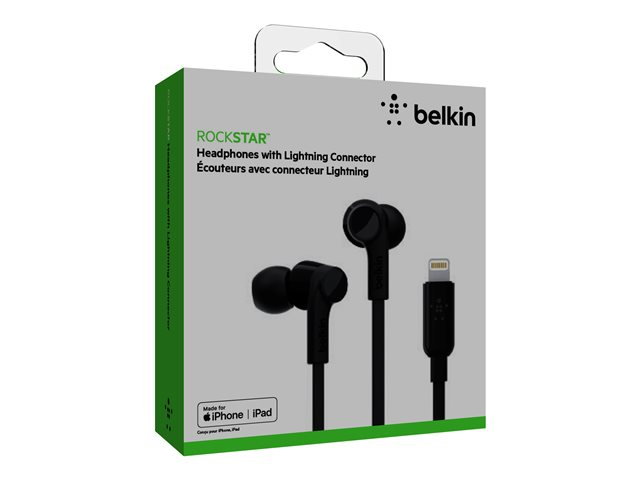 Belkin ROCKSTAR - Écouteurs avec micro - intra-auriculaire - filaire - Lightning - isolation acoustique - noir - pour Apple 10.5-inch iPad Pro; iPad mini 4; iPhone 7, 7 Plus, 8, 8 Plus, X, XR, XS, XS Max G3H0001BTBLK